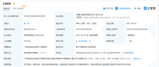 工商信息显示,中融汇信期货广西分公司曾经是南宁营业部。在2021年4月成立之际,曾一倍就担任负责人。2024年,广西分公司参保人员为6名。